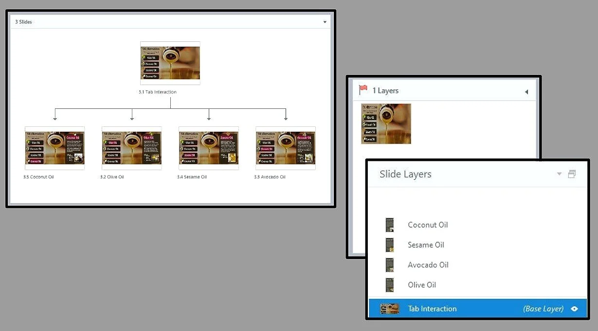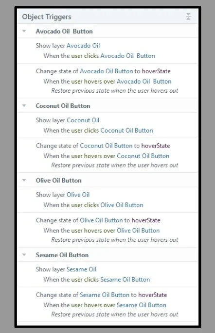 Ultimately, the full development of this project was completed using a combination of layers and states. Additionally, I used triggers to enable the user to move back and forth between different tab choices. The result is a user-friendly, informative tab interaction tool that provides information about healthy oil alternatives.