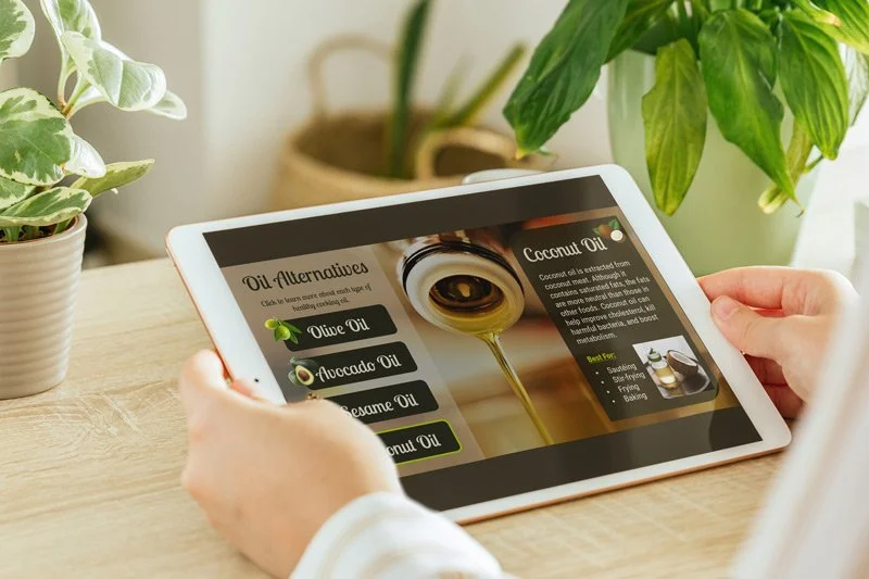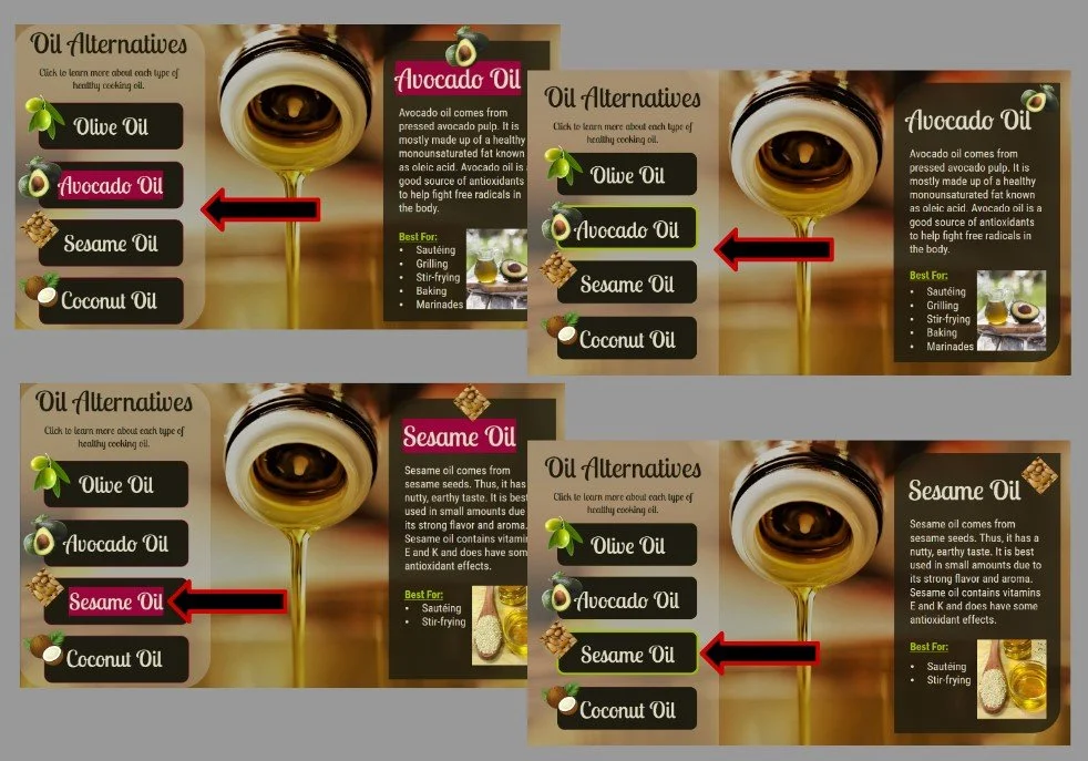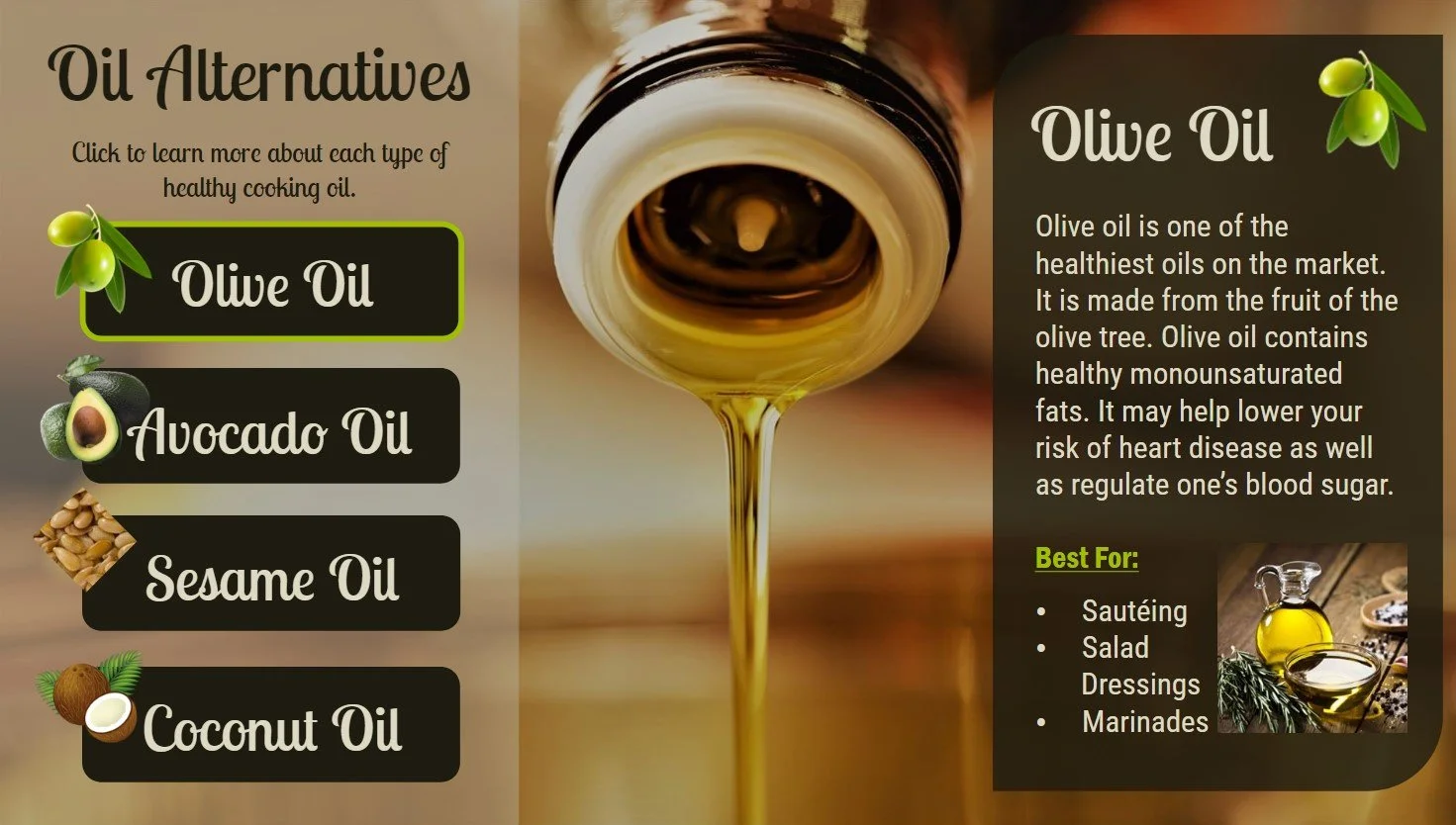 This eLearning tab interaction helps individuals quickly learn about healthy cooking oil alternatives and what use they best serve.