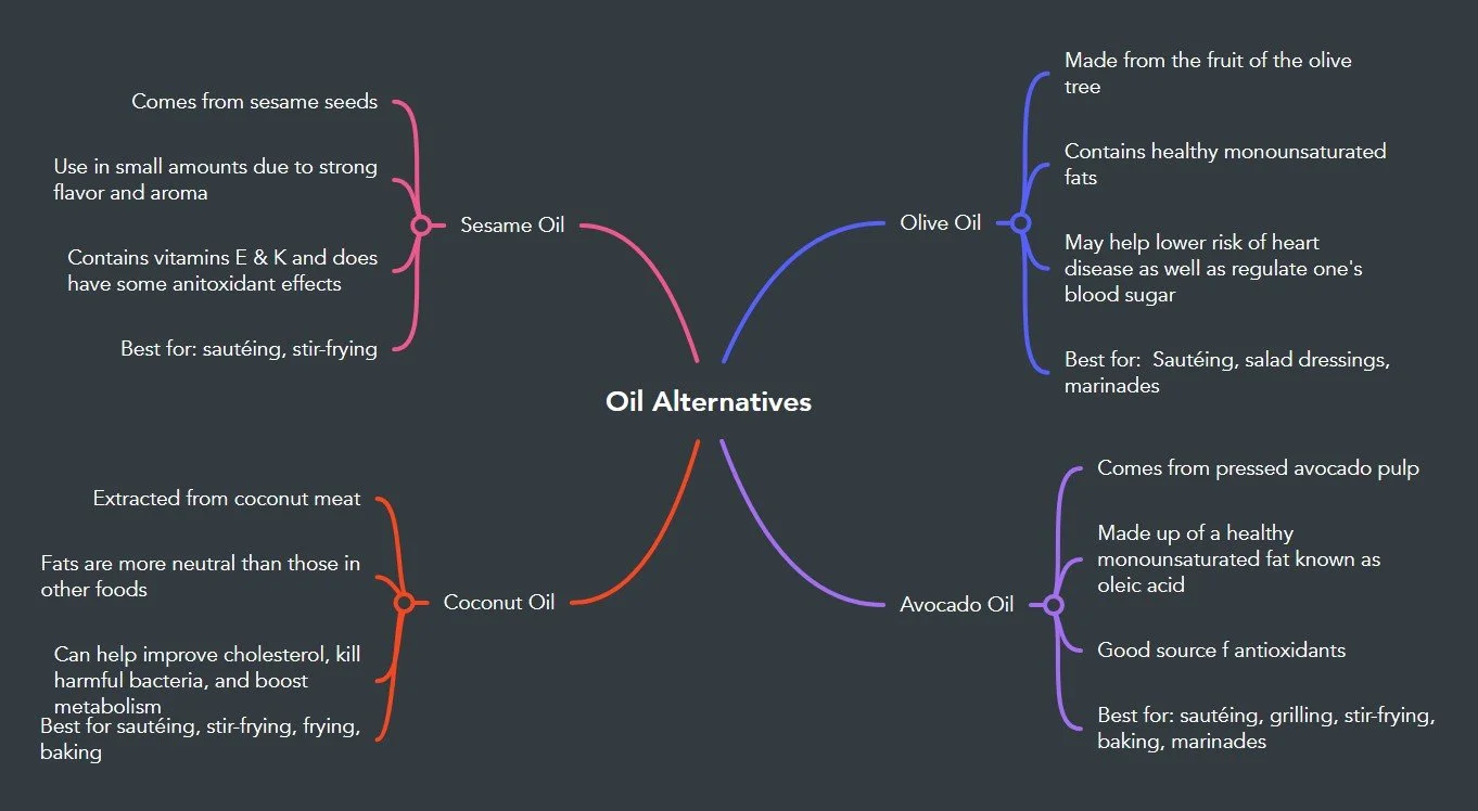Growing up in a home with a mother who was very health conscious, I had some knowledge of healthy oil alternatives. However, to ensure accuracy and expand my knowledge, I researched information about healthy cooking oil alternatives and created a mind map to help organize the information.