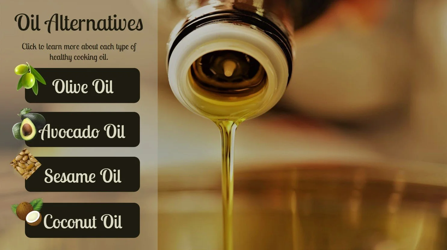 Making healthy food choices contributes significantly to one’s overall well-being. However, it is imperative that when preparing those healthy meals, one carefully weighs the options they have for cooking oil alternatives. Many might be wondering, “Which oil is best for me?” I designed this concept eLearning tab interaction project to inform cooks about healthy cooking oil alternatives and what use they best serve.